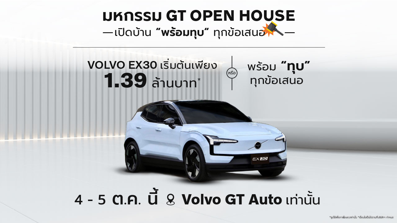 GT Auto #ให้คุณมากกว่าใคร จัดงาน มหกรรม GT Open House เปิดบ้าน พร้อม“ทุก” ข้อเสนอ สำหรับรถยนต์ Volvo EX30 Fully Electric...